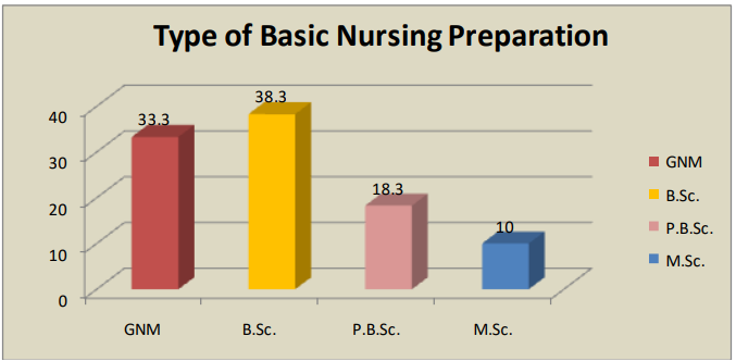 The table II & figure 4, the bar diagram shows the Types of Basic Nursing Preparation of Staff Nurses working in Selected Hospitals at Jaipur. 33.30% of respondents were the GNM, 38.30% of respondents were the B.Sc., 18.3% of respondents were the P.B.Bsc. and 10.0% of respondents were the M.Sc.