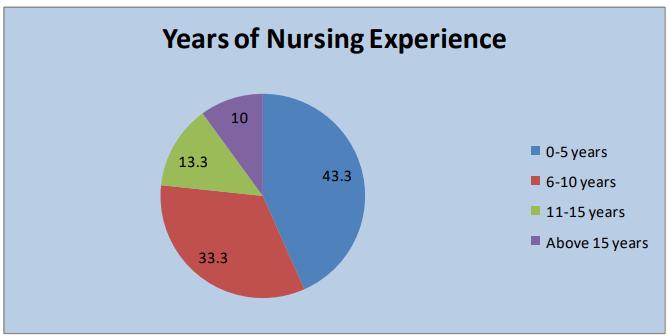 The table II & figure 5, the pie diagram gives the Years of Nursing Experience of Staff Nurses working in Selected Hospitals at Jaipur. 43.30% of respondents were the between 0-5 years, 33.30% (20) of respondents were the between 6-10years, 13.30% of respondents were the between 11-15 years and 10.0% of respondents were the between above 15 years.