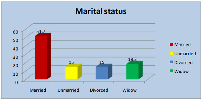 From the table II & figure 6, the bar diagram is showing the Marital Status distribution. It shows that 51.70% of respondents were the Married, 15.00% of respondents were the Unmarried, 15.00% of respondents were the Divorced and 18.3% of respondents were the Widow.