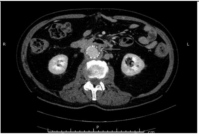 D. Angio-CT: aorto-duodenal fistula (white arrow).