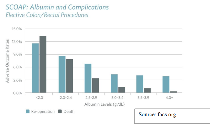 Patients with malnutrition, obesity, or chronic conditions such as diabetes exhibit higher rates of surgical complications. Studies indicate that poor preoperative nutritional status increases the risk of postoperative complications three- to fourfold (Zikria & Bianchi, 2020). Additionally, the American College of Surgeon (2024) demonstrated that patient with albumin levels lower than 3.0 have higher post-op complications in GI surgeries.