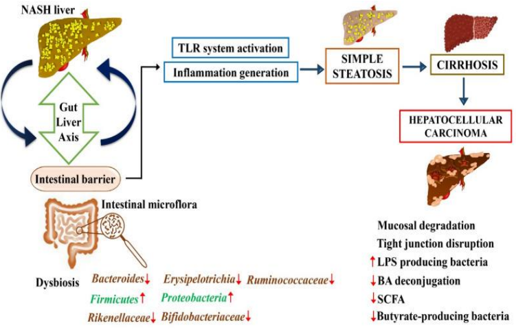 Courtesy ref no -36-Progression of liver disease from MASH to hepatocellular carcinoma via gut–liver axis dysregulation. The figure illustrates the pathological progression from MASH to HCC through disruptions in the gut–liver axis. The MASH liver exhibits alterations in the intestinal barrier and gut microbiota, leading to dysbiosis characterized by fluctuations in key bacterial populations. The dysregulated gut microbiota affects the intestinal barrier's integrity, fostering mucosal degradation and tight junction disruption. This breakdown facilitates the systemic infiltration of lipopolysaccharides (LPS) and other bacterial metabolites into the liver through the portal circulation. Increased TLR (Toll-like receptor) activation in the liver induces inflammation, progressing from simple steatosis to cirrhosis and ultimately culminating in hepatocellular carcinoma. Key changes in microbial populations include increased Firmicutes and Proteobacteria, with a decrease in Bacteroides, Erysipelotrichia, Ruminococcaceae, Rikenellaceae, and Bifidobacteriaceae. The figure also notes a decrease in bile acid (BA) deconjugation, short-chain fatty acids (SCFA), and butyrate-producing bacteria, which are critical to maintaining hepatic and intestinal health. Symbols: ↑increase, ↓decrease