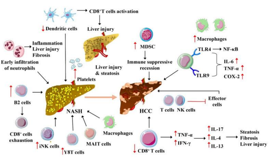 Courtesy ref no -36-Potential mechanisms for gut microbiota-associated immune modulation in MASH–HCC progression. This figure illustrates the complex immune interactions and cellular transformations involved in the progression from MASH to HCC. Key features include the early infiltration of neutrophils leading to inflammation, liver injury, and fibrosis, and the role of B2 cells and CD8 + T cells in modulating the immune response. Activation of CD8 + T cells contributes to further liver injury and steatosis, while the presence of myeloid-derived suppressor cells (MDSC) indicates an immune suppressive state facilitating cancer progression. The diagram also highlights the activation of macrophages through toll-like receptors (TLR4 and TLR9) leading to an increase in inflammatory cytokines (IL-6, TNF-α) and COX-2, which are important in the development of HCC. Additionally, the impact of various cytokines such as TNF-α, IFN-γ, IL-17, IL-4, and IL-13 on the hepatic environment, promoting steatosis, fibrosis, and liver injury, is depicted. Abbreviations and symbols: B2 cells: a type of B cell involved in immune response; CD8 + T cells: cytotoxic T cells which are a part of the immune system that kills cancer cells, virus-infected cells, and other damaged cells; COX-2: cyclooxygenase-2, an enzyme that plays a crucial role in inflammation; HCC: hepatocellular carcinoma; IFN-γ: interferon gamma, a cytokine critical for innate and adaptive immunity; IL-4: interleukin 4, a cytokine involved in the regulation of immune responses; IL-6: interleukin 6, a cytokine involved in inflammation and maturation of B cells; IL-13: interleukin 13, involved in inflammatory responses; IL-17: interleukin 17, a pro-inflammatory cytokine; iNK cells: invariant natural killer T cells, a component of the immune system that recognizes lipid antigens; MAIT cells: mucosal-associated invariant T cells, involved in the mucosal immunity; MDSC: myeloid-derived suppressor cells, regulate immune responses in cancer; NASH: non-alcoholic steatohepatitis