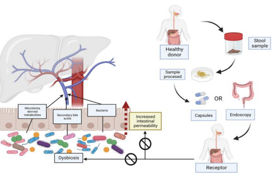 Courtesy ref no -75-Non-alcoholic-fatty-liver-disease (NAFLD)-related dysbiosis and increased intestinal permeability and the utility of faecal microbiota transplantation (FMT). The increase in intestinal permeability enables bacteria and their metabolites to reach the liver through the portal system. In FMT, a stool sample is taken from a healthy donor. After processing, it will be administered to the receptor subject with NAFLD. The FMT can be performed in different ways, either orally or by endoscopy or enemas. FMT is intended to reverse existing dysbiosis and restore the intestinal barrier, and consequently improve the severity of the disease.