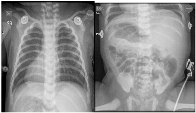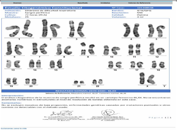 Newborn female referred from San Vicente de Paul Hospital for respiratory distress syndrome and suspected congenital heart disease, this is a 1 day old newborn, the result of the fifth pregnancy, a 41 year old mother, 39 weeks gestation, Grava 5, 2 stillbirths, prenatal check-ups number 5, blood type O positive, mother has gestational diabetes, perinatal screening: HIV negative, VDRL non-reactive, Hepatitis B negative, Toxoplasma IGG positive and IGM negative, delivered by cesarean section due to iterative, born with the following anthropometric parameters: weight 3520 grams, height 50 cm, head circumference 36 cm, chest circumference 35 cm. Spontaneous neonatal adaptation, Apgar 8 - 10 - 10, at birth the baby develops respiratory distress syndrome with a 3-point Silverman - Anderson score, for which reason they are transferred to the newborn unit, non-invasive ventilation is started, a chest x-ray is taken where dextrocardia is evident, for which reason they are referred to the UROS Clinic for comprehensive management in the neonatal intensive care unit. On admission, the patient was hemodynamically stable and showed no signs of low output. He received noninvasive ventilatory support with a high-flow nasal cannula, a FIO2 of 35%, with saturation at target levels. However, during hospitalization, the patient's respiratory condition deteriorated with increased effort, increased retraction, and thoracoabdominal dissociation. Therefore, orotracheal intubation was performed with a 3.5 tube, which was 10 cm from the commissure. Ventilation parameters were adjusted. The patient's progress was favorable. Venous blood gases were taken and showed a pH of 7.32, PO2 35, PCO2 43, HCO3 22, BE -3.9, and lactate of 4.1 with normal serum electrolytes. A chest x-ray was taken and showed a cardiac silhouette on the right and a liver on the left. He ventilated 9 intercostal spaces. without opacities, diagnosis situs inversus totalis , hemodynamically well perfused without low output with blood pressure and heart rate at goals, without indication of inotropic support, heart sounds audible on the right. pulses present. Complementary studies are performed CENTRAL NERVOUS SYSTEM ULTRASOUND study within normal limits, TOTAL ABDOMEN ULTRASOUND An alteration in the position of the abdominal organs is striking, observing the spleen in the right hypochondrium and the liver in the left hypochondrium. Liver of normal shape, size and echogenicity, without focal or diffuse lesions in its parenchyma. Gallbladder and bile duct without alterations. Kidneys, spleen, pancreas and retroperitoneum of normal ultrasound appearance. Empty bladder which prevents assessment of pelvic organs. No masses, collections or free fluid are identified in the abdominal cavity. OPINION: ALTERATION IN THE POSITION OF ABDOMINAL ORGANS (SPLEEN AND LIVER) AN ECHOCARDIOGRAM IS SUGGESTED TO RULE OUT DEXTROCARDIA, ECHOCARDIOGRAM by pediatric cardiology showing CONSERVED SYSTODIASTOLIC FUNCTION OF THE LEFT VENTRICLE TAPSE 9 MM TRICUSPID AND PULMONARY FAILURE PHYSIOLOGICAL OVALE FOSSA 4.1 MM PSPE 34.7 MMHG RESTRICTIVE DUCTUS TOWARDS CLOSURE, DEXTROCARDIA, multidisciplinary evaluations are performed GENETICS patient in stable general condition situs inversus totalis is an alteration that occurs in about 1:10,000 people, with a higher prevalence in men than in women. It is important to rule out whether this occurs in isolation or as part of a more complex syndrome. It is important to keep in mind that 80% of patients have heart disease, which is why a transthoracic echo is required to rule out any anomaly of this type. Additionally, it is important to rule out primary ciliary dyskinesia due to the history of respiratory failure reported by the service. A karyotype with G banding is requested, genomic hybridization is requested (study of deletions and duplications) PEDIATRIC NEUROLOGY patient with high neurological risk due to congenital malformation, with neurological examination with deficit for gestational age, weak suction for gestational age, with echo of the central nervous system without pathological alterations, I request a CEREBRAL MRI Clinical information: situs inversus. Findings: The myelination pattern is normal for the age. The signal from the brain parenchyma does not show alterations. Gray nuclei of the base and thalami without alterations. Subarachnoid space and ventricular system within normal limits for the age. Hypothalamic-pituitary axis, pineal region and corpus callosum of normal appearance. Structures of the posterior fossa without findings of pathological value. Preserved craniovertebral junction. Significant bilateral Oto mastoid occupation. Mucosal thickening in the pneumatized paranasal cavities. Conclusion: Significant bilateral Otomastoid occupation . Intracranial structures within normal limits for age. PEDIATRIC PULMONOLOGY chest x-ray situs inversus, without air leak, adequate lung expansion, OTORHINOLARYNGOLOGY patient with suspected immotile cilia syndrome, currently stable, an electron microscopy of the nasal mucosa is ordered, which can be performed on an outpatient basis, should continue with periodic check-ups by otorhinolaryngology, PEDIATRIC OPHTHALMOLOGY patient with no alterations in the ophthalmological examination, is considered within normal parameters. Control in 6 months , PEDIATRIC CARDIOLOGY newborn with dx of total situs inversus , the echocardiogram showed a systolic pulmonary pressure of 35 mmHg and a restrictive ductus, heart in dextrocardia without dyspnea or cyanosis, finally the patient shows favorable evolution, it is possible to withdraw respiratory support, outpatient follow-up is ordered by different specialties.