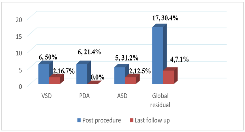 17 children (30.5%) had a residual defect at 1st post-procedure Echocardiogram, but this came down in the last follow-up to 4 children (7.3%) (Figure 1). Moreover, 54 children (99.2%) were electively admitted. The median time between the last follow-up and the date of the procedure is 2.4(0.1-13.4) years. 1 patient (1.8%) passed away 8 months post-procedure due to chest infection (Table 5). Additionally, due to lower limb thrombosis, 9 of these patients (16.5%) experienced a prolonged hospital stay, mostly associated with the Amplatzer device (Figure 2).