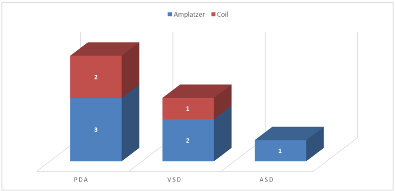 Table (4): shows that age at the procedure was 2.9 ± 5.9 months, weight at the procedure was 11.09 ± 1.80, 49.1% had PDA device closure, 21.8% had VSD device closure and 32.7% had ASD device closure.