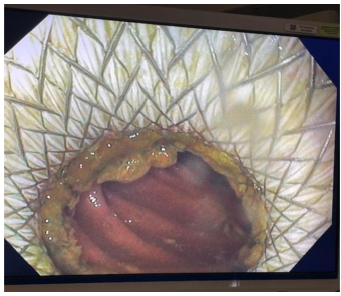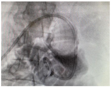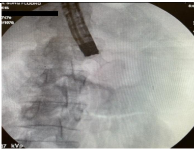 The procedure involved passing a guide wire beyond the obstruction using a gastroscope using contrast dye under fluoroscopy. Then the 8.5 Fr nasobiliary cannula (Boston Scientific, Marlborough, MA) was passed over the guide wire beyond the luminal obstruction and to achieve that a balloon extraction catheter (Boston Scientific, Marlborough, MA), was used since the length of the cannula was not adequate (Figure 3). Then using a linear array echoendoscope (Olympus, Center Valley, PA) from the stomach a suitable jejunal segment beyond the obstruction was selected by passing the diluted contrast agent through the cannula. Using both the images from the echoendoscope and fluoroscope 20 mm x 10 mm lumen apposing metal stent (LAMS) Axios (Boston Scientific, Marlborough, MA) was successfully deployed (Figures 4, 5, and 6).