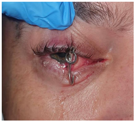 Fig 1: Barb piercing the lower palpebral conjunctiva