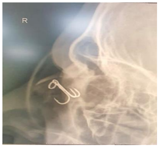 A 42 year old fisherman by occupation was trawling for fishes. And while doing so, suffered injury to the right eye wherein the hook was embedded. His colleagues cut off the line and made no attempt to remove the hook. He was immediately transferred to our facility for management within three hours of sustaining trauma.