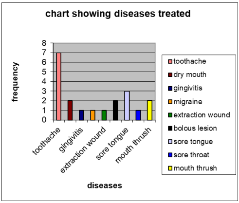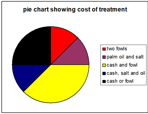 Another objective was to find out their cost of treatment , the most interesting result was that ,some ailments were treated very cheaply ,like in the treatment of sore mouth where the patient could pay with salt, and palm oil while others were very expensive unlike dental caries where it is belief that worms responsible for the pain are removed, the reason for high cost of two fowls ,cash, and palm wine.