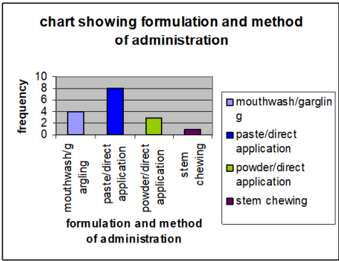 Moreover, the researchers set out to assess the methods of preparation and to an extend the research team was interested in knowing their methods of preservation after preparation .The most interesting finding was that the plants were mostly prepared in the paste form, some of which were used in the treatment of dental caries by removing worms responsible for the pain by direct application. Other forms were ;powder ,gel ,and as toothbrush .It was also discovered that due to availability of the plants, once plants were prepared and used, especially the paste brush and gel, they were discarded immediately while the powders and solutions could be used for a longer period for as long as one week.