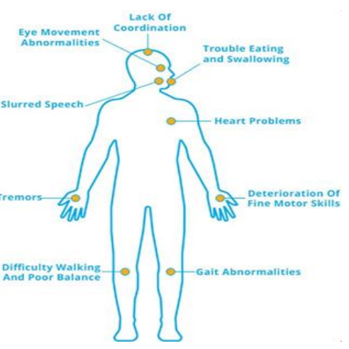 Ataxia is a neurological disorder that affects the coordination of body movements. People with ataxia may have difficulty performing simple movements such as walking, standing, and picking up objects. The disorder can affect different parts of the body, such as the arms, legs, trunk, and even the eyes.