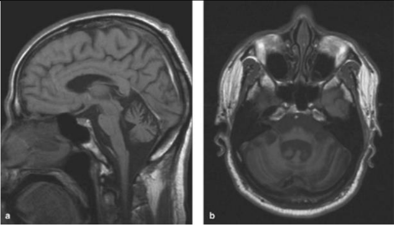 Accurate diagnosis of SCA type is crucial for determining disease prognosis, genetic counseling, and selecting appropriate treatment MRI scan (sagittal and transverse T 1 -weighted image) of a 72-year-old woman with idiopathic late-onset cerebellar ataxia (ILOCA gradually progressive isolated cerebellar syndrome). Obvious atrophy of the cerebellar vermis, also of the brainstem (5)
