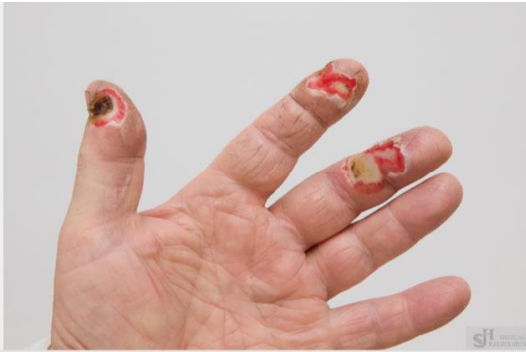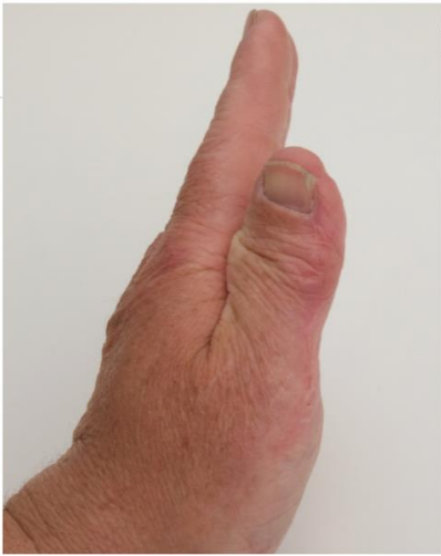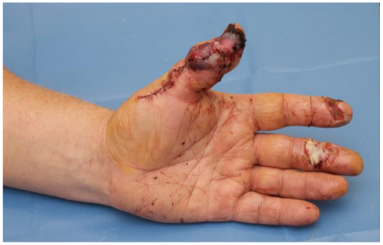 A 60 year-old gentleman presented to our service following electrical burn to his left hand with a deep injury to the radial side of distal phalanx of the thumb, and intermediate depth injury to the distal phalanx of his index finger and middle and distal phalanges of the middle finger (Fig.1).