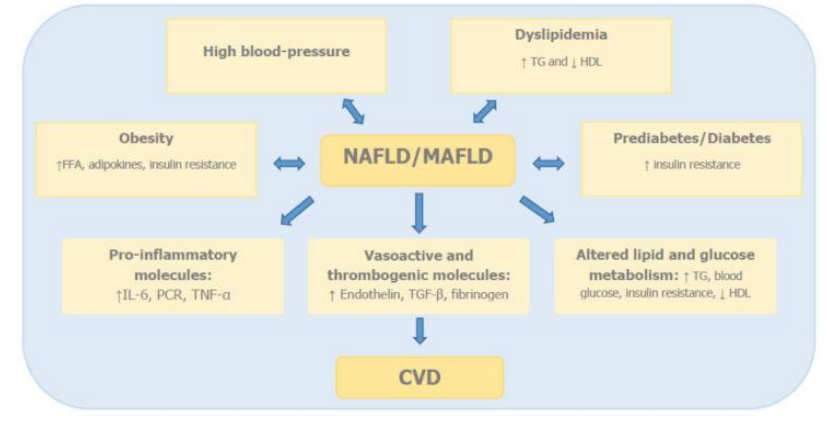 Various studies clearly demonstrated that NAFLD and MAFLD patients have not only a higher risk of hepatic events but also of extrahepatic complications mostly cardiovascular disease (CVD) and extrahepatic cancers, suggesting that NAFLD/MAFLD is part of a multisystemic disease and identifying in the severity of liver fibrosis the most relevant prognostic factor. In addition, different studies conducted to compare NAFLD and MAFLD highlighted that differences exist between the two entities on identifying patients at high risk of progression and of extrahepatic complications.