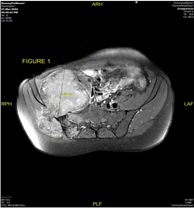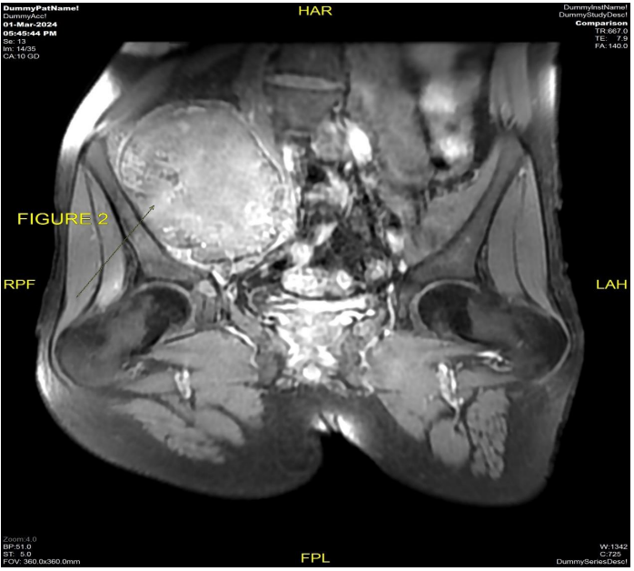 The patient underwent MRI pelvis (Fig 1 & 2) and PETCT (Fig 3 & 4) for initial evaluation (03/2024) at our institute which showed ill-defined large altered signal intensity heterogeneously enhancing mass in the right lumbar region with both intra as well as intrapelvic component by causing erosion of the right iliac bone involving the adjacent iliopsoas and gluteus muscles with central necrosis. On PET-CT scan the lesion showed significant FDG uptake with no other abnormality in the rest of the scan. Text the patient was planned for neoadjuvant chemotherapy and then for surgery. Patient took 2 cycles of neoadjuvant chemotherapy (Holoxan and Adriamycin), but after 2 cycles of chemotherapy response evaluation MRI was done (01/07/2024) (Fig 5) which showed increase in the size of lesion, so patient was planned for targeted therapy ie tyrosine kinase inhibitors, Pazopanib.