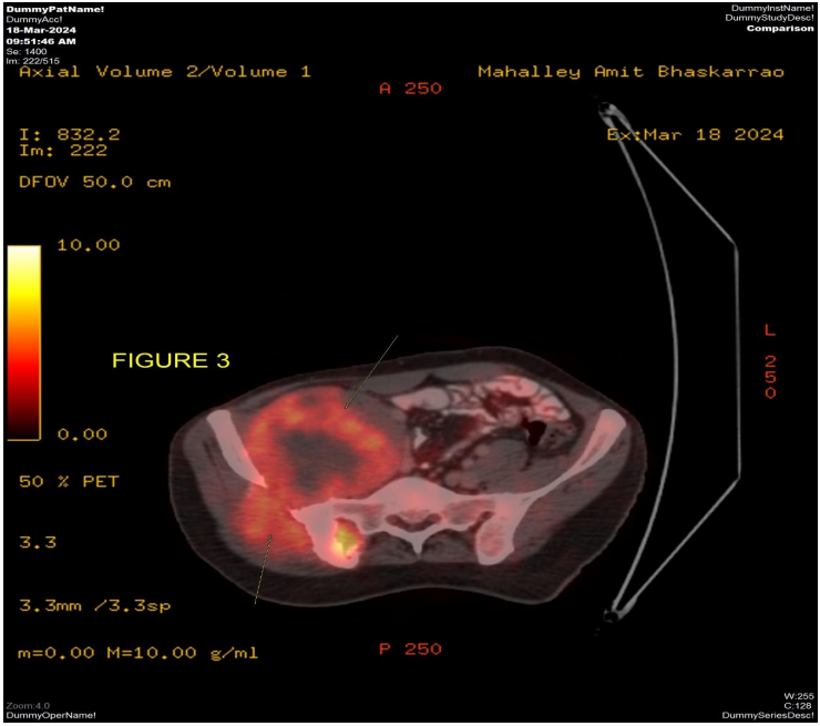 Figure 3: PETCT scan dated 03/2024 axial pelvic view shows ill-defined heterogeneous significantly FDG avid necrotic mass involving the right lumbar and pelvic region causing erosion of the adjacent right iliac bone and transverse process of S1 and S2 Vertebrae with both intra as well as extrapelvic component.