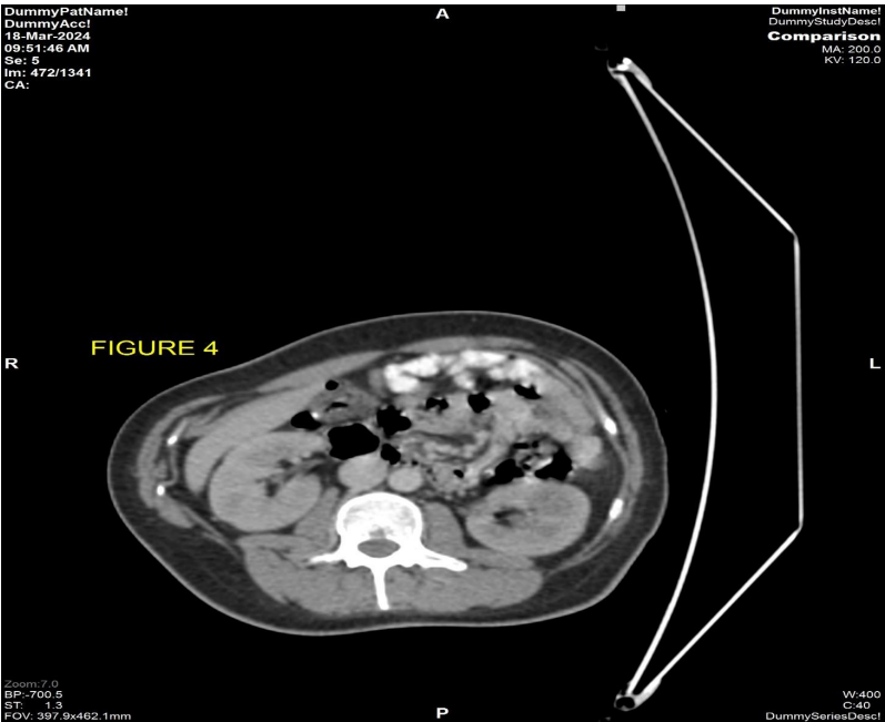 Figure 7: CECT abdomen dated 07/02/2024 axial post contrast view shows complete resolution of the previously seen diffuse circumferential bowel wall thickening with submucosal fat is seen involving the jejunal loops.