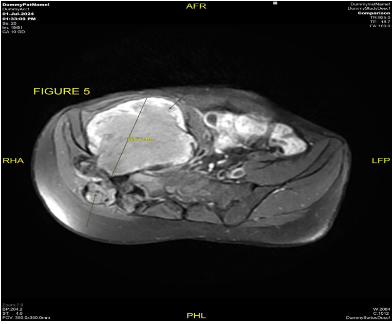 Figure 5: MRI pelvis dated 07/2024 axial view T1 post-contrast sequence shows interval increase in the size of ill-defined heterogeneously enhancing necrotic mass measuring approximately 10.5 cm in AP dimension involving the right lumbar and pelvic region causing erosion of the adjacent right iliac bone and transverse process of S1 and S2 Vertebrae with both intra as well as extrapelvic component.