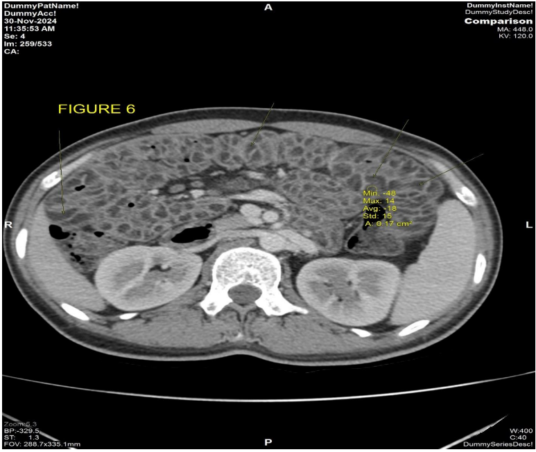 Figure 6: CECT abdomen dated 30/11/2024 axial post contrast view shows diffuse circumferential bowel wall thickening with submucosal fat is seen involving the jejunal wall with HU of -13, consistent with fat.