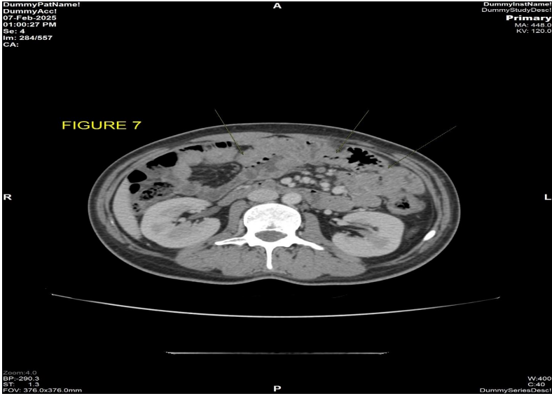 Patient complaint of abdominal pain with diarrhea and weight loss since 1 month, so a CECT thorax abdomen pelvis (Fig 6) was performed on 30/11/2024, which showed no interval change in the size and necrosis of the right lumbar region lesion, however there was new onset significant bowel wall thickening with submucosal fat deposition (-18 HU) mild luminal narrowing involving the entire jejunum with maximum thickness of 15 mm. [4]