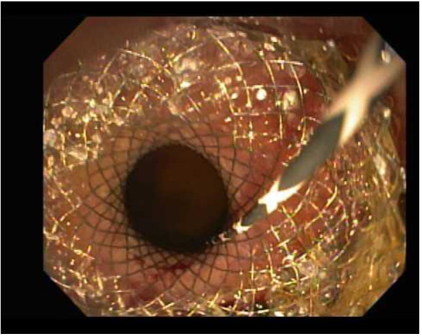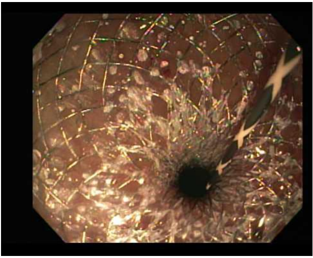 Figure 4. Endoscopic image showing the fully expanded lumen-apposing metal stent (LAMS) following balloon-assisted dilation, ensuring optimal drainage from the gallbladder to the stomach. Courtesy of Tony Brar, M.D.