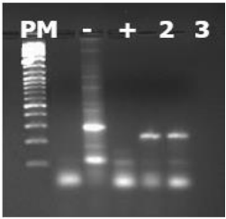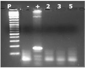 Figure 3: PCR results of the cDNA of the gene encoding IGF : the well contents from left to right are as follows: well 1: size marker, well 2: negative control, well 3: positive control (PCR performed on genomic DNA), wells 4, 5, 6: PCR product from samples 2, 3, 5. The size of the PCR product is 242 bp.