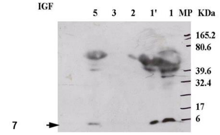 The WB results, obtained after hybridization with the anti-IGF antibody, revealed a distinct band at the expected size of 7 kDa. This band was detected both in the amniotic fluid (Figure 8, samples 1 and 1') and in well 5. These findings indicate that IGF is predominantly secreted, with a substantial amount also found in the tissue.