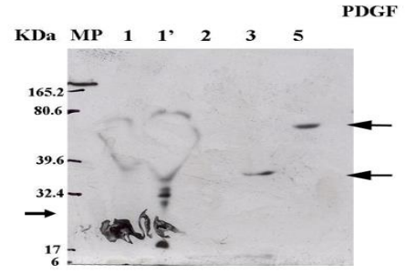 Considering that the TGF-β growth factor has various isoforms, it can be detected at 12, 16, 22, 26, 30, and 46 kDa. In our study, the membrane labeling with the anti-TGF-β antibody revealed bands at 16 kDa present in all samples and another at 12 kDa specifically in samples 1, 1', and 5.