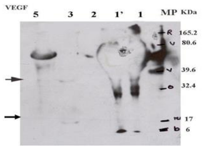 The anti-VEGF antibody labeling reveals bands at 30 kDa in samples 1, 1’ to 6, a band at 19 kDa in sample 3, and another at 38 kDa in samples 3 and 5. According to different sources, VEGF can vary in molecular weight from 19 to 40 kDa depending on the cell source.