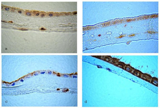 Figure 10: Sections illustrating the presence of various growth factors in the amniotic membrane. All sections are captured at 100x magnification.