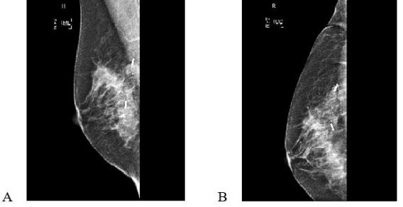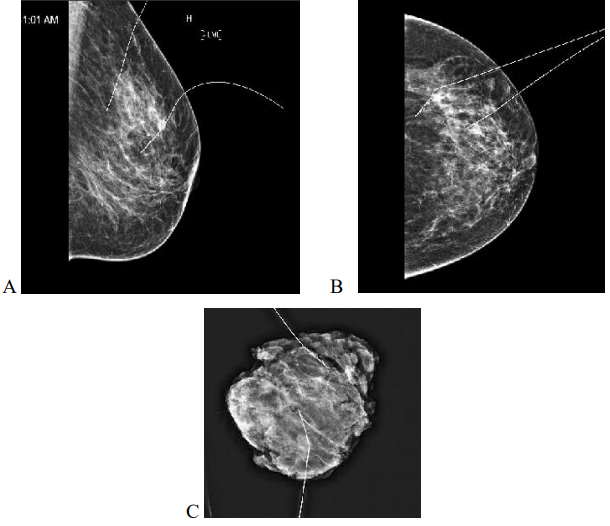 Directly after the procedure, cranio-caudal (CC) and medio-lateral (ML) mammograms were obtained to confirm accurate placement (Figure 1). Skin marking with a permanent pen was also done to indicate site and depth of lesion if the localization was performed on the day of surgery to aid the site of surgical excision. In most cases the localization was done to bracket the extreme ends of the lesion either medial and lateral or superior and inferior.