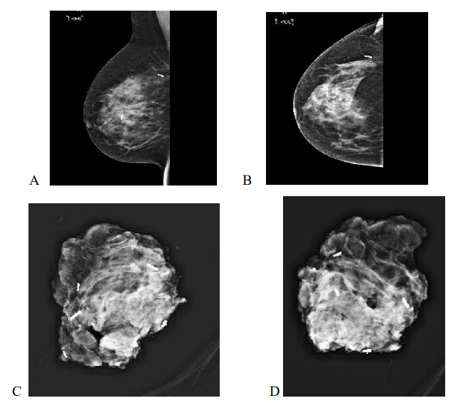 Figure 3: 63yr old with 24 BMI, Bra size 36 DD with invasive carcinoma measuring 66 mm on pre op imaging, post op specimen weighed 129gm, tumerectomy and partial breast reconstruction with chest wall perforator flap. Margins clear. Mediolateral (A) and Craniocaudal (B) mammograms showing two RFID tags marking the medial and lateral extent of disease with specimen X rays shows radiologically clear margins (C,D)