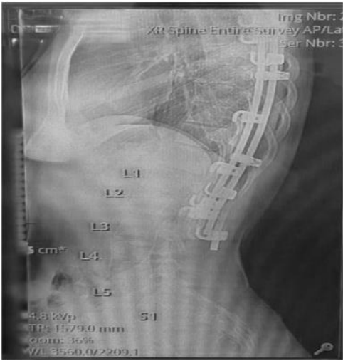 MRI of the spine revealed posterior corrective surgery with metallic implants from D4 down to L3 with preserved vertebral bodies and alignment with residual thoracolumbar scoliosis.