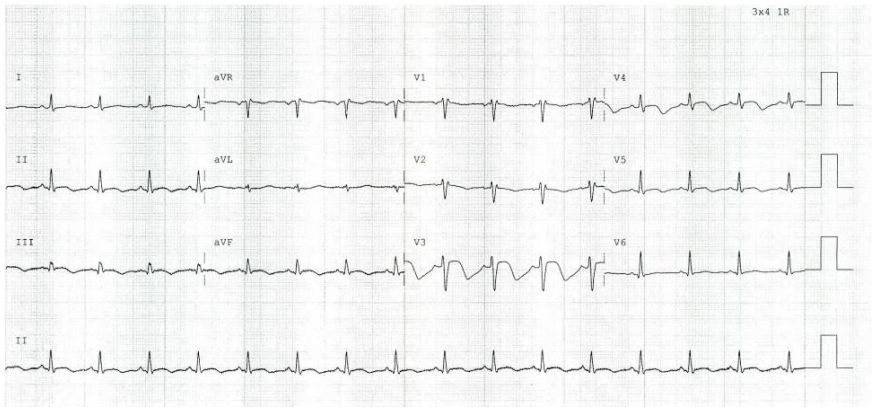 She was readmitted to the hospital with recurrent episodes of conscious VT. Following cardioversion for VT in the emergency department, her ECG demonstrated ST-elevation myocardial infarction (STEMI) features. Although she had a history of LAD stenosis with stent placement several weeks prior, repeat coronary angiography revealed a patent LAD stent and no new coronary occlusion. During her ICU admission, her ECG showed Brugada features, and she continued to experience recurrent VT. She was commenced on quinidine 200 mg three times daily and metoprolol 25 mg twice daily. An implantable cardioverter-defibrillator (AICD) was inserted. Radiofrequency ablation was considered but deemed challenging due to the tumor burden in her pelvis.
