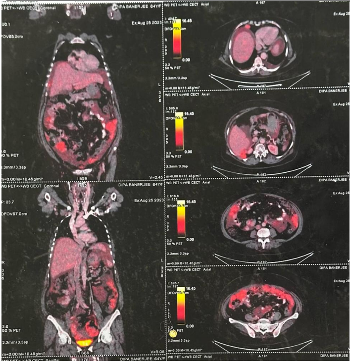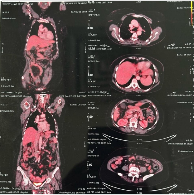 First-line Therapy: The patient received six cycles of Cisplatin and Etoposide, leading to a significant response as noted on interim PET-CT scans [Fig 2]. However, disease progression was observed post-treatment.