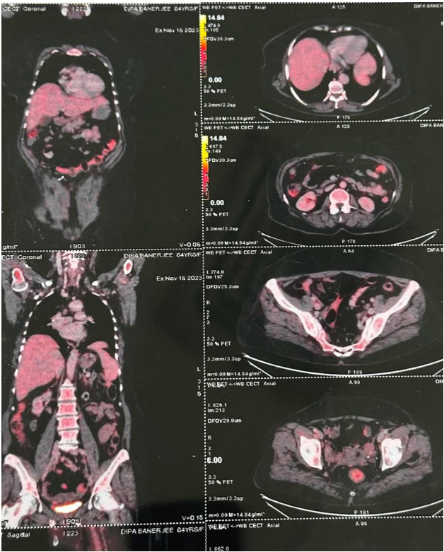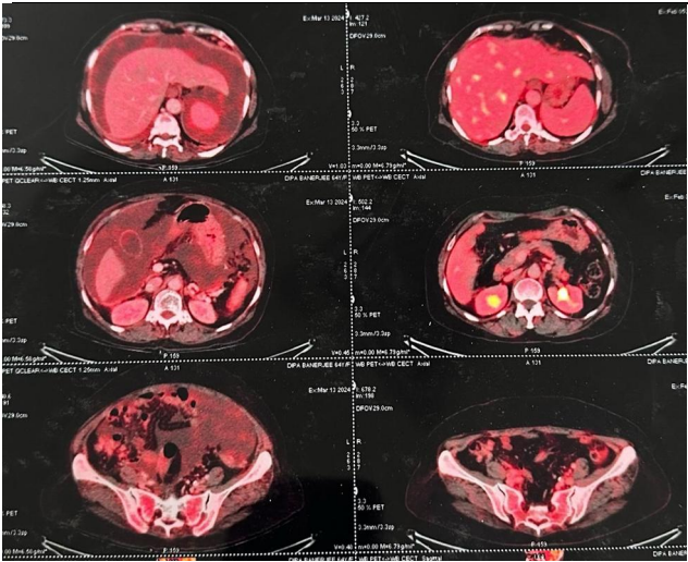 Second-line Therapy: FOLFIRINOX was initiated following disease progression, achieving significant interim response in PET CT scan [Fig.4]. Chemotherapy was continued with a plan to reassess for surgical intervention.