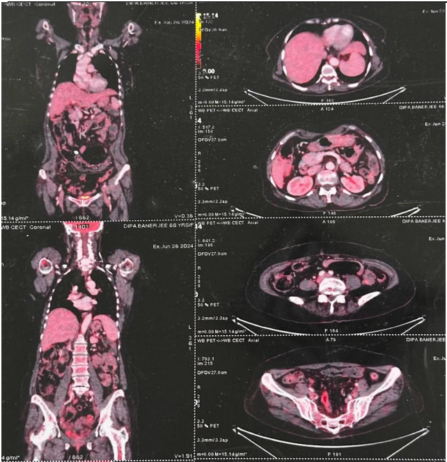 The patient was initiated on platinum-based chemotherapy (cisplatin and etoposide), completing six cycles with a significant initial therapeutic response noted in an interim PET-CT scan (February 2024). However, disease progression was observed with increased tumor burden on subsequent imaging (March 2024). She was transitioned to second-line therapy with the FOLFIRINOX regimen in March 2024, which showed a significant interim response on follow-up PET-CT scans (June 2024). The patient’s condition continues to be monitored, with ongoing chemotherapy providing further disease control. She completed six cycles in October 2024, and a PET-CT scan post-second-line chemotherapy showed further response. This case illustrates the challenges of managing advanced ovarian NEC, emphasizing the need for a multimodal therapeutic approach.