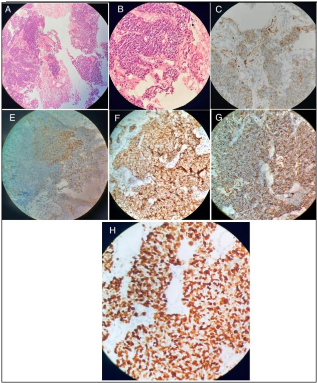 Figure 6 A & B: Histopathology images showed a malignant tumor arranged in sheets and nested patterns. The tumor cells showed hyperchromatic nuclei with stippled chromatin, nuclear molding, inconspicuous to prominent nucleoli, brisk mitosis, apoptosis, and areas of necrosis. (A-H&E 100x, B-H&E 400x); Tumor cells are positive for CK 7 (6C: 400x); CA125 (6D: 400x); Synaptophysin (6F: 400x); Chromogranin (6G: 400x). Ki67 proliferation index was 90-95% at (6H: 400x).