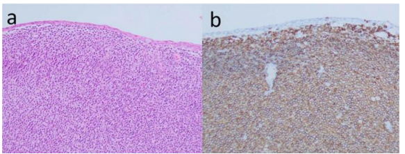b. CD20 IHC shows predominance of positive B cells