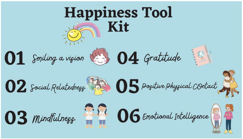 The six components of the toolkit include smiling a vision, social relatedness, mindfulness, gratitude, positive physical contact, and emotional intelligence, as seen below in Figure 1.