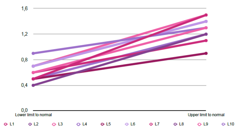 Figure 1: Serum creatinine reference values for 10 clinical laboratories where DMMC’s out-patients used to perform their blood tests: 6 at Douala, 2 at Yaounde, 1 at Buea and 1 at Limbe. Serum creatinine values in mg/dl. The 4th cindynics dimension ( reference values, see below).