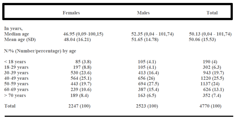 In this study, 74.5% of the subjects had a single creatinine analysis. Improving CKD awareness and screening by physicians and laboratories would help to build a better follow-up and ensure repeat testing where appropriate. As expected, we found a significant difference in the creatinine distribution between females and males above 18 years. eGFRs were slightly higher in females. Men tend to have a greater body surface area, which is the main predictor of kidney size. Females were also younger than males: 36.2% vs 24.6% below 40 years, 38.7% vs 49.4% above 50 years. Ageing kidney is known to be a determinant risk factor for AKI/CKD. Therefore, different groups may require different reference values. In children, the values would be determined by child age, height, size with the Schwartz (creatinine) formula.