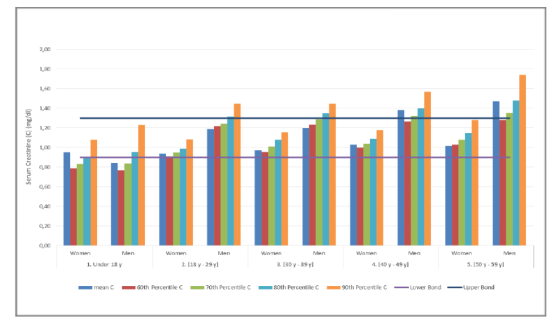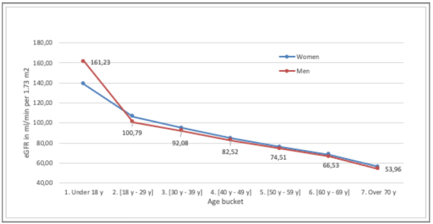 Findings: 7028 measurements were analyzed. The mean and median serum creatinine values were 1.2 mg/dl (SD 1.1) and 1.10 mg/dl (range 0.21 - 34 mg/dl) respectively. eGFR ranged from 1 to 238.6 ml/min per 1.73m2 with a mean value of 70.2 ml/min per 1.73m2. Serum creatinine was significantly different between females and males (p <0,005) above 18 years but not below (p=0,5). Mean eGFR was slightly higher in females above 18 years: 72.6 ml/min per 1.73m2 (SD 26,6) vs 68.3 ml/min per 1.73m2 (SD 28,8) in males. In the subgroup with normal ranges of serum creatinine, normal eGFRs (above 90 ml/min per 1.73m2) were present 8.6% in females and 43.7% in males. In this same subgroup, eGFRs below 60 ml/min per 1.73m2 were present 13.4% in females vs 0.1% in males.