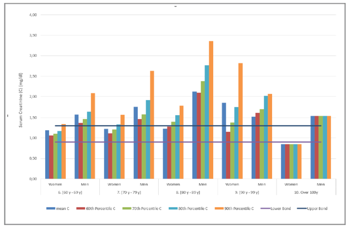 In the single laboratory using CKD-EPI equation, more detailed analysis was conducted. The standards (normal ranges) were 0.9 to 1.3 mg/dl, using a standardized colorimetric- kinetic Jaffe method (ROCHE, SA).