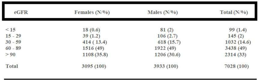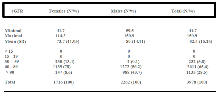 In the subgroup with normal ranges of serum creatinine according to the laboratory, eGFRs were below 60 ml/min per 1.73m2 for 13.4% in females, 0.1% in males. eGFRs were above 90 ml/min per 1.73m2 for 8.6% in females vs 43.7% in males (Table 3).