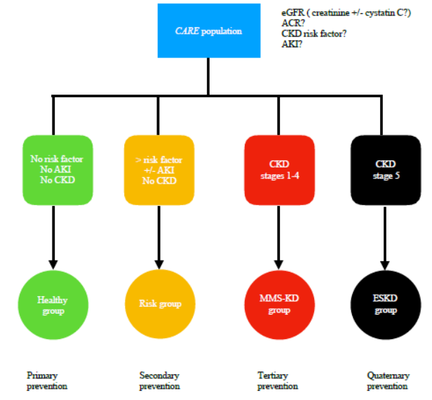 Healthy, risk, MMS-KD, ESKD populations will require a specific follow-up (Fig.7). Primary prevention will be applied in healthy individuals to avoid AKI/CKD or any risk factor. Secondary prevention will aim to detect and stop earlier kidney disease in the risk group, including AKI. In the MMS-KD group, tertiary prevention will be provided to control CKD and delay the progression to the ESKD, using nephroprotective agents and other specific means. For the ESKD group, quaternary prevention will avoid premature deaths through optimal KRT (dialysis, kidney transplantation) or conservative treatment.