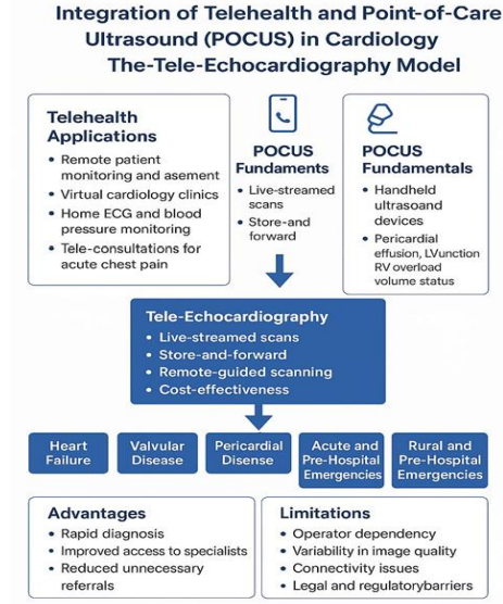 Cardiovascular diseases (CVDs) remain the leading cause of mortality and morbidity worldwide (1). Timely diagnosis, monitoring and management of cardiac conditions are essential to reduce the burden of CVDs. Recent advancements in telehealth and point-of-care ultrasound (POCUS) have reshaped cardiac care by offering new diagnostic and therapeutic opportunities outside traditional clinical environments (2,3). Telehealth enables remote patient evaluation, follow-up, and management, while POCUS provides immediate cardiac imaging at the bedside or in remote settings (2,4). Their combination, termed tele-cardiac ultrasound or tele-echocardiography, has shown promising results in emergency departments, intensive care units, prehospital settings, outpatient cardiology and rural healthcare delivery (3,5). This mini- review summarizes the integration, applications, advantages, challenges and future perspectives of telehealth and POCUS in cardiology, with a focus on improving access, patient outcomes, and health system resilience.
