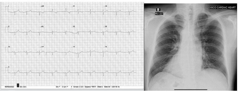 55 year old male known case of Hypertension presented to the Cardiology Clinic at Tabba Heart Institute with complains of chest pain that was central, aggravated on exertion and relieved at rest, initially CCS 2 in intensity but worsened to CCS 3 over the past 10 days. The ECG done showed Extreme right Axis Deviation, with upright P wave R wave in aVR. It also showed prominent R wave in lead V1 with poor R wave progression. All findings suggestive of dextrocardia.